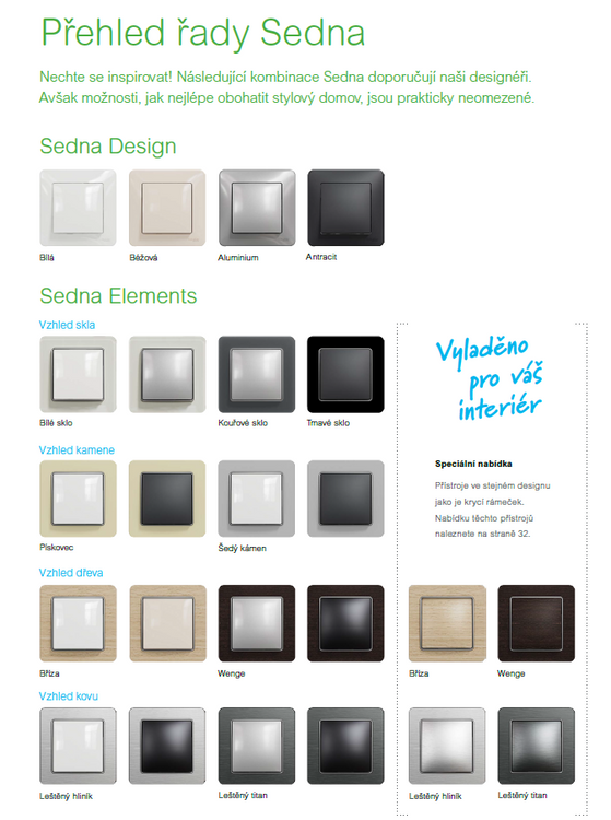 Nová nabídka doplňuje základní barvy v Sedna Design (bílá, béžová, aluminium a antracit), i nabídku Sedna Elements v luxusnějších dekorech - Skla (tmavé sklo, kouřové sklo a bílé sklo) o dekory dřeva (wenge a bříza), kovu (leštěný hliník a leštěný titan) a dekory kamene (pískovec, šedý kámen). Základní přístroje seženete i v dekoru kovu a dřeva, což váš interiér sladí k úplné dokonalosti.